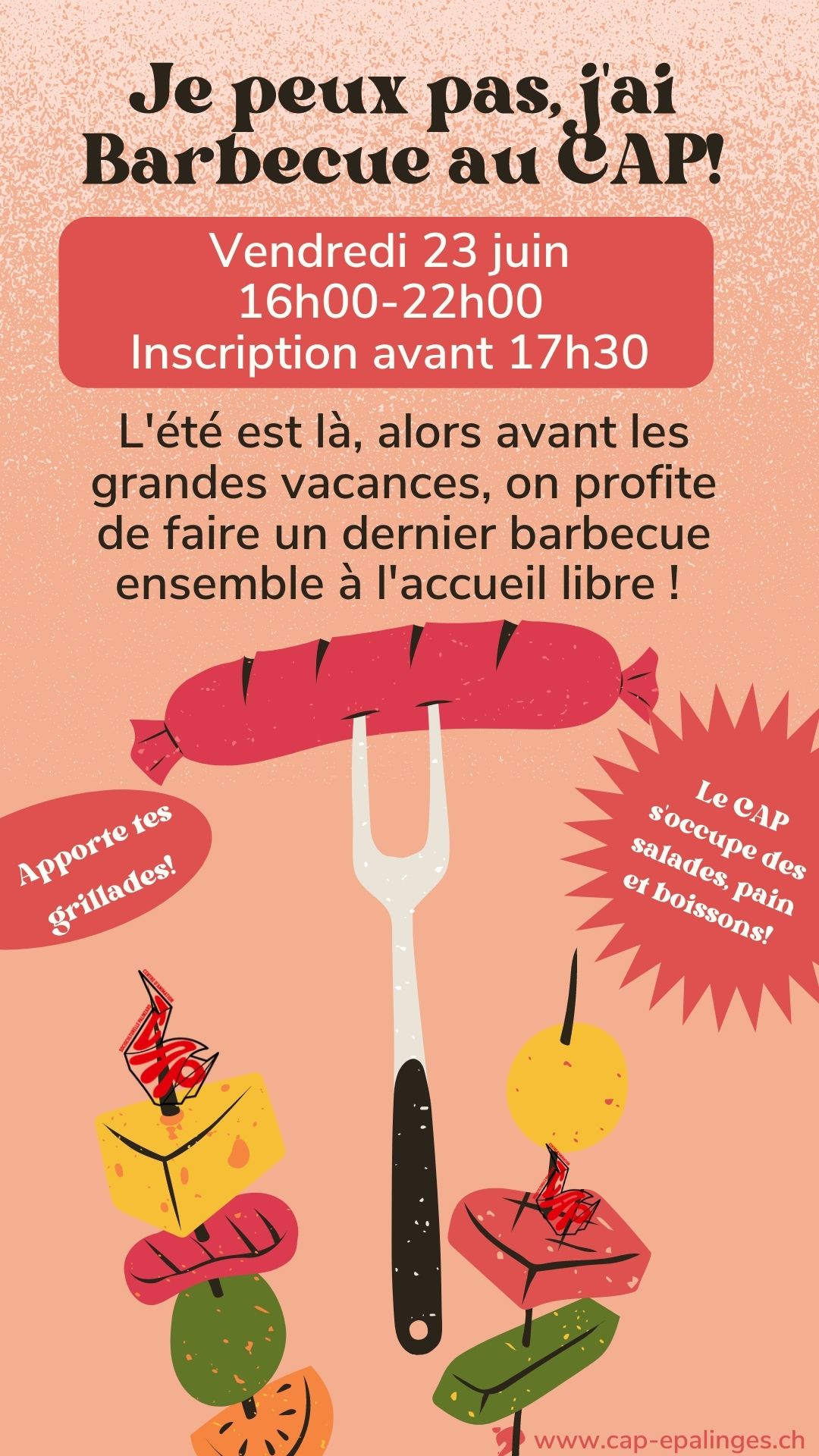 Pour célébrer en beauté le dernier vendredi du semestre, l’accueil libre, dès 12ans, vous propose l’incontournable BBQ de fin d’année! Comme d’habitude, chacun.e amène de quoi griller sur le grill et le CAP vous invite aux salades, pain et boissons! Annoncez-vous nombreuses.eux auprès des l’équipe, jusqu’à 17h30 le vendredi.
