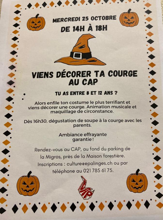 **Attention: Pour inscrire les enfants de 8 à 12 ans à la « courge Party » du 25.10, merci d’envoyer un mail directement à culture@epalinges.ch ou par téléphone au 021 785 61 75