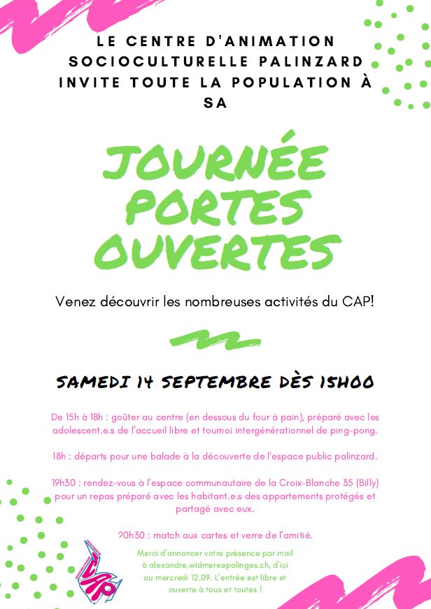 LE CAJE DEVIENT LE CAP ET ON VOUS OUVRE GRANDES NOS PORTES ! De 15h à 18h : goûter au centre (en dessous du four à pain), préparé avec les adolescent.e.s de l’accueil libre et tournoi inter- générationnel de ping-pong. 18h : départs pour une balade à la découverte de l’espace public palinzard. 19h30 : rendez-vous à l’espace communautaire de la Croix- Blanche 35 (Billy) pour un repas préparé avec les habitant.e.s des appartements protégés et partagé avec eux. 20h30 : match aux cartes et verre de l’amitié. Merci d’annoncer votre présence par mail à alexandre.widmer@ epalinges.ch, d’ici au mercredi 12.09. L’entrée est libre et ouverte à tous et toutes ! Nous nous réjouissons de vous retrouver nom- breuses et nombreux à cette occasion !