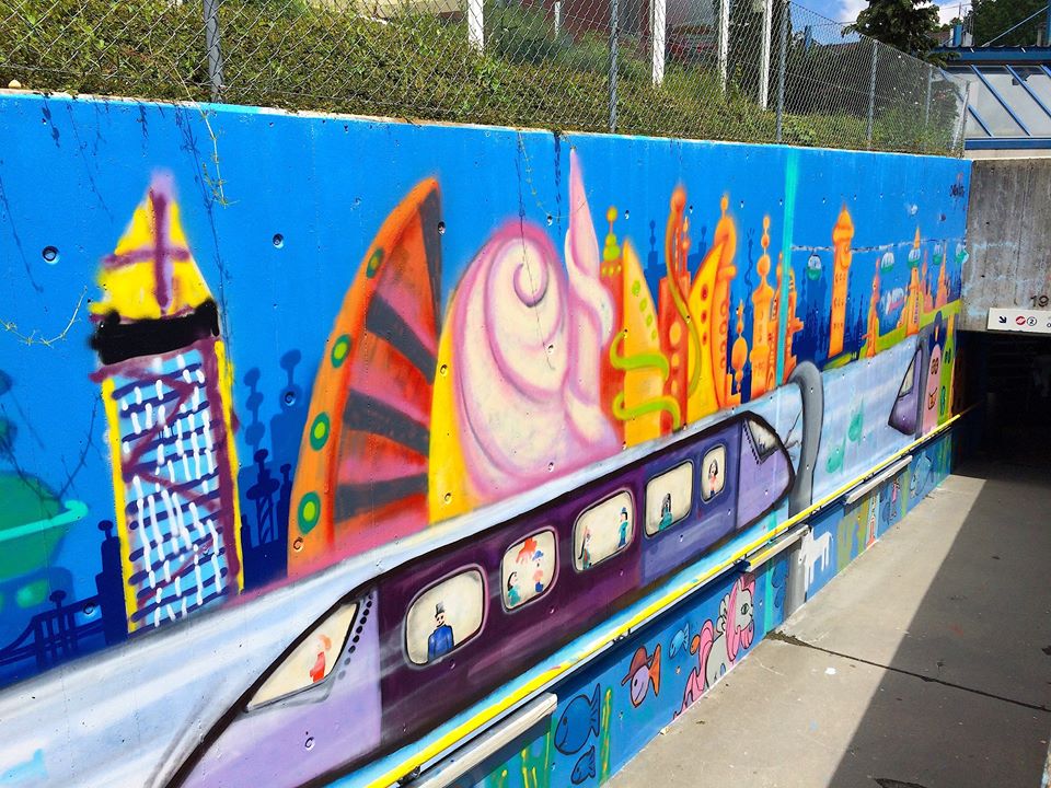 Au mois de septembre il avait plu et on avait dû annuler la finalisation de la peinture du sous-voie. Mais cette fois, on espère fort qu’il fera doux et qu’on pourra enfin faire les contours de nos créations : tulipes, fleurs-pains, rollers et jars à cornes.