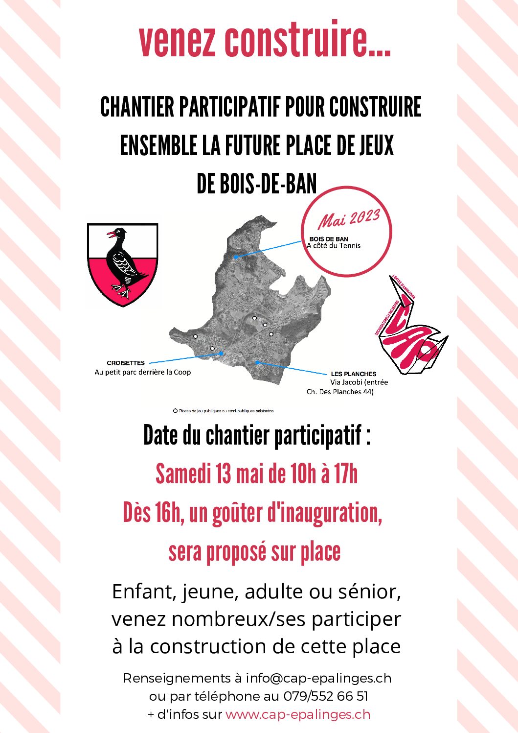Samedi 13 mai** de 10h à 17h ! C’est l’occasion de découvrir ce qui a été imaginé par les habitant.e.s pour ce lieu et de participer à la construction et à l’aménagement de cette place de jeux. Soyez les bienvenu.e.s à ce moment festif, ouvert à toutes et tous, pendant lequel des « cabanes en bois » seront construites avec la supervision de L’atelier Olga et la participation du CAP. Retrouvez-nous sur place, à coté du tennis. Dès 16h00: Ne manquez le goûter d’inauguration, l’occasion de se réunir, dans un cadre convivial, et d’échanger autour de cette journée et du projet.