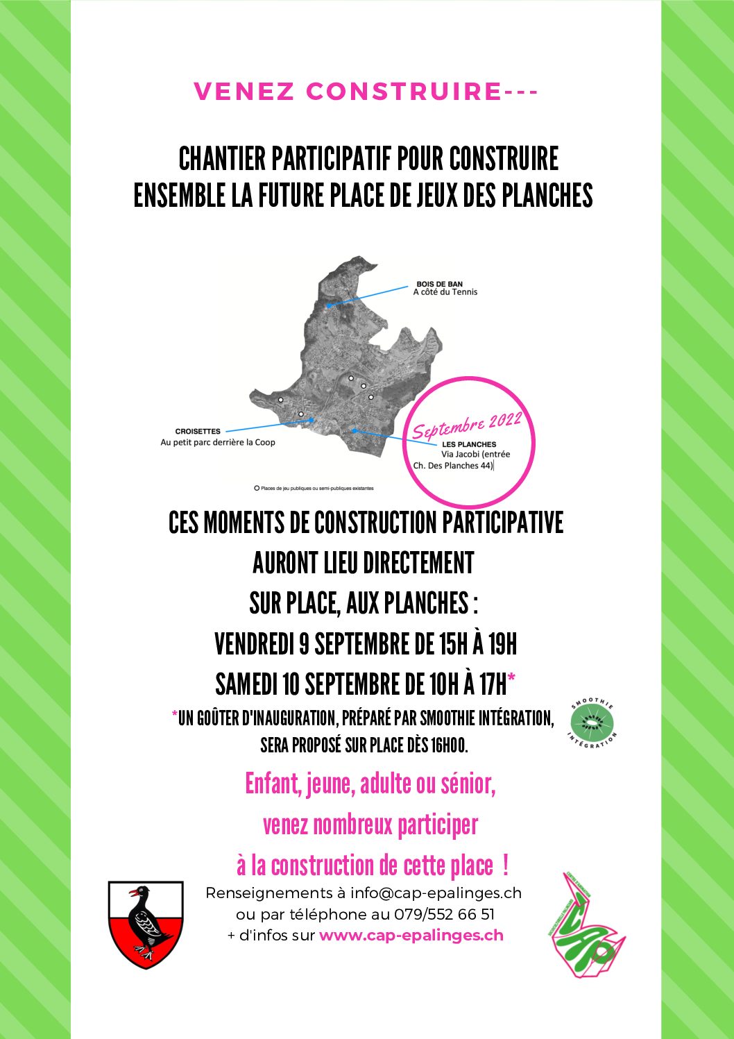 La Municipalité́ via le CAP et L’atelier Olga sont heureux de vous annoncer les dates du chantier participatif de la future place de jeux des Planches. C’est l’occasion de découvrir ce qui a été imaginé pour ce lieu et de participer, en direct, à la construction et à l’aménagement de la place. Le chantier participatif est conçu comme un moment festif et ouvert à toutes et tous. Soyez les bienvenu.e.s durant 2 jours!