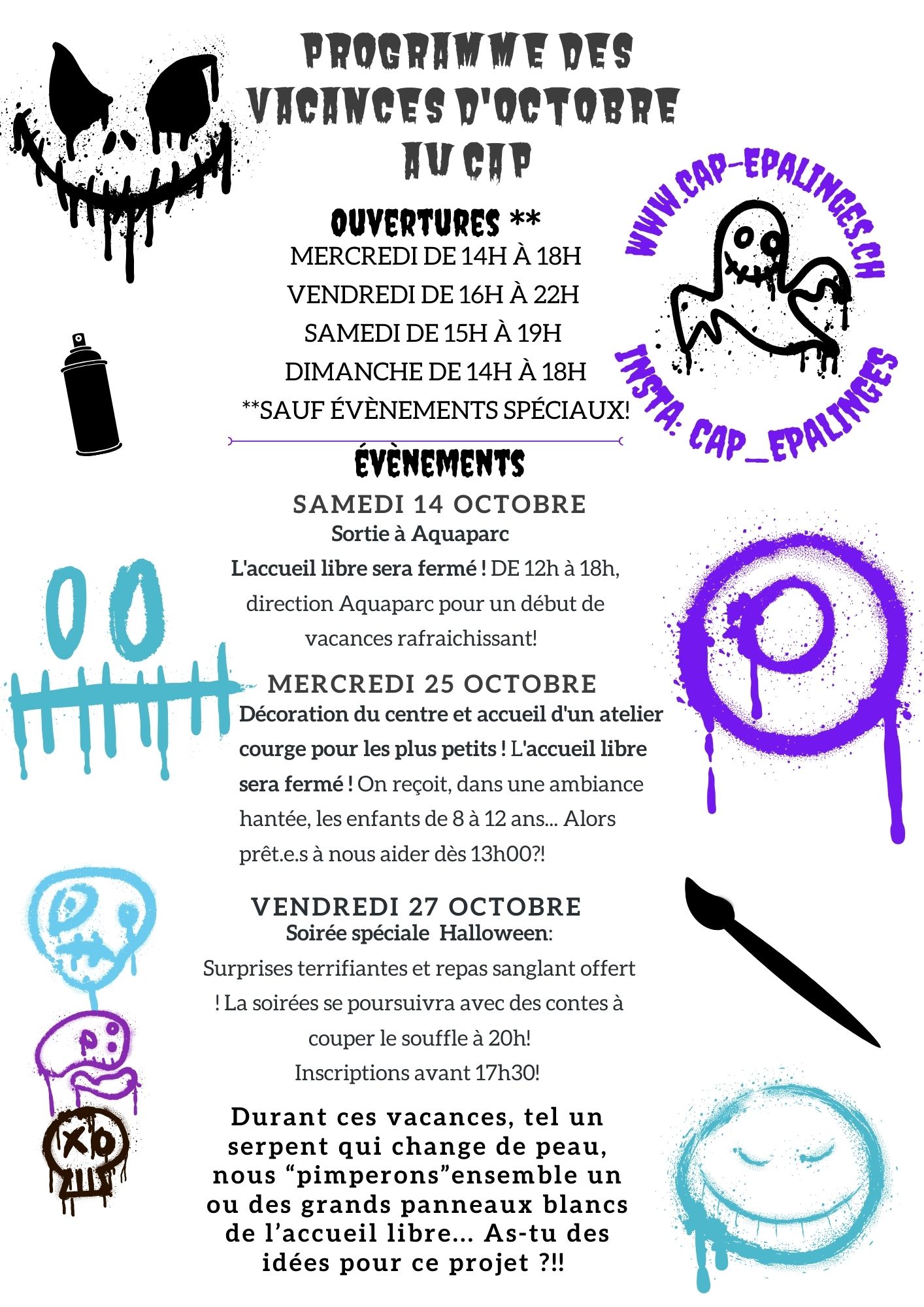 Durant les vacances d’octobre l’accueil libre reste ouvert aux horaires habituels ! Venez nombreux.euses profiter du CAP « en mode vacances »: se lancer dans des soirées sushis, préparer des cookies, décorer le centre au couleur de Halloween ou encore découvrir des nouveaux jeux de société et même profiter de ne rien faire !